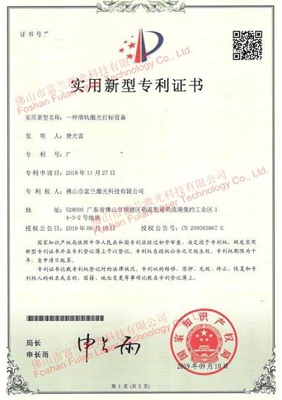 一种滑轨激光打标设备 专利证书